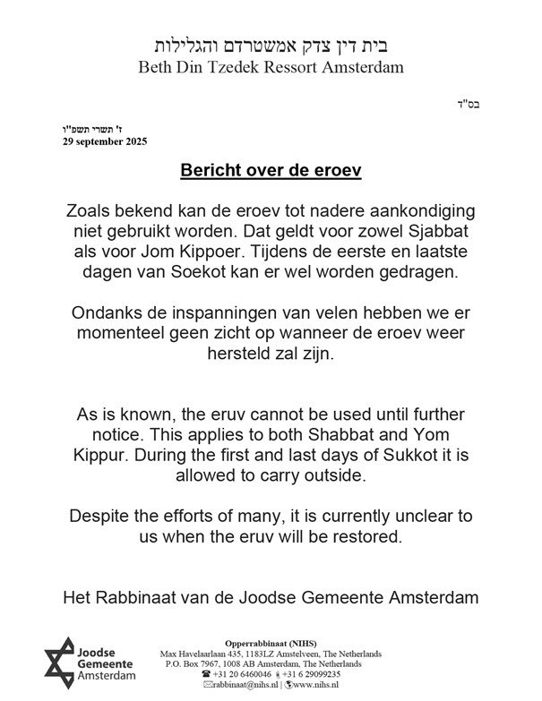 Een Rabbijn controleert elke week (lezenzwaardig artikel) of de Eruv nog afsluitbaar is. Dit wordt op deze site gepubliceerd. Momenteel is de eruv wegens renovatiewerkzaamheden (geen idee wat die behelzen) "plat".